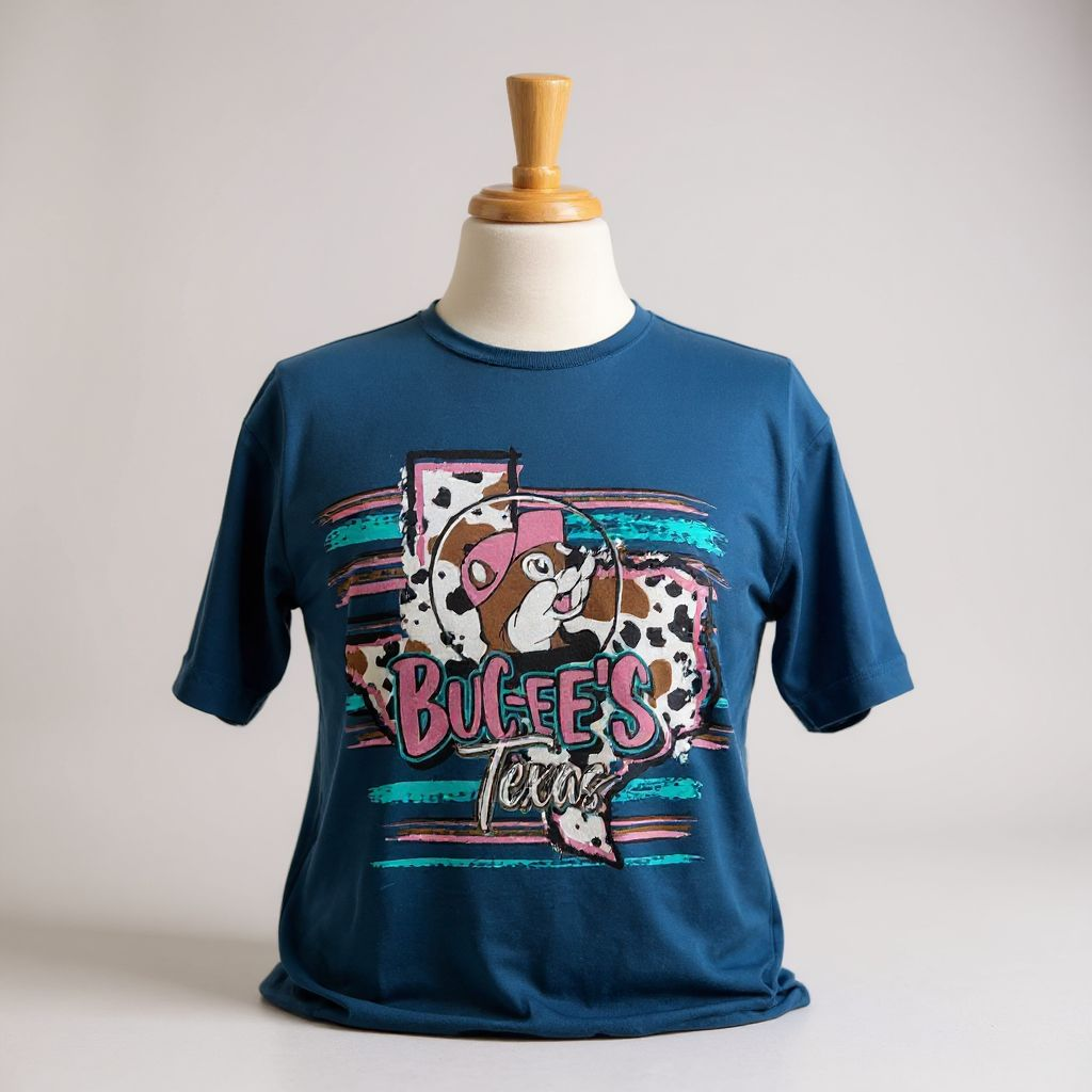 Show off your Texan pride with our Buc-ee's Texas T-shirt. Featuring a playful cow print design, this shirt is both unique and comfortable. Perfect for a day out in the Lone Star state or just lounging at home.